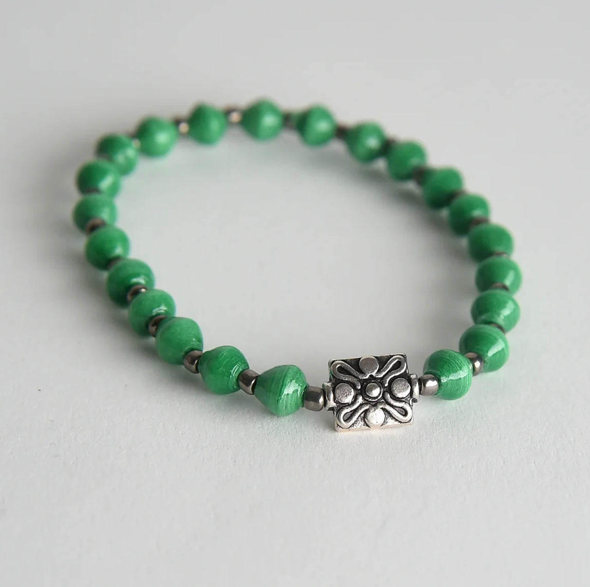 These fabulous recycled paper beads are a true sign of resilience and are made with hope by women in Northern Uganda. Our Charmed Bracelets are bubbling with colour. Crafted by folding small pieces of paper into a triangle and refolding them numerous times to the required size. Beads are dyed and shellacked (non-toxic), hung to dry, and then strung together with a small charm and ready for your wearing pleasure! Strung on elastic for easy fit. Silver-colored charm made with a non-toxic metal alloy. One size (S/M)