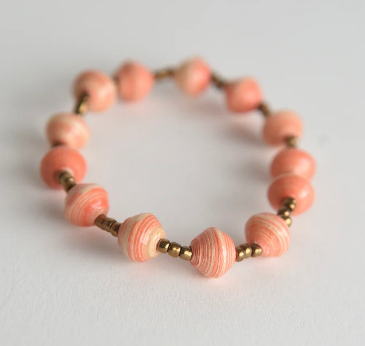Each bracelet is made with hand-rolled paper beads and accented with shimmering brass glass spacers, creating a lightweight yet durable design. The set includes nine assorted vibrant colours, offering many ways to mix, match, and layer.