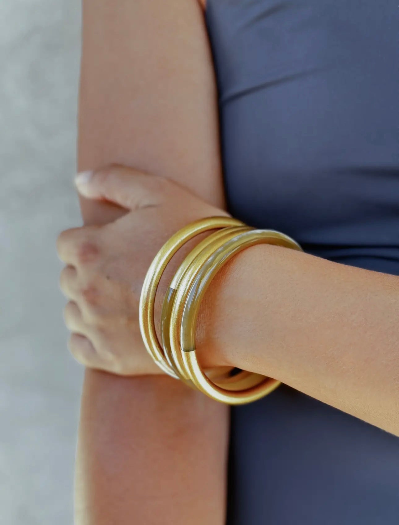 Each bangle is made from recycled buffalo horn, sourced sustainably from animals consumed for their meat. The bone is polished and enhanced with naturally dyed lacquer in rich, eye-catching hues, giving every piece a unique character. These Golden Glow Bangles bring warmth to your wardrobe and radiate sunshine with every move.