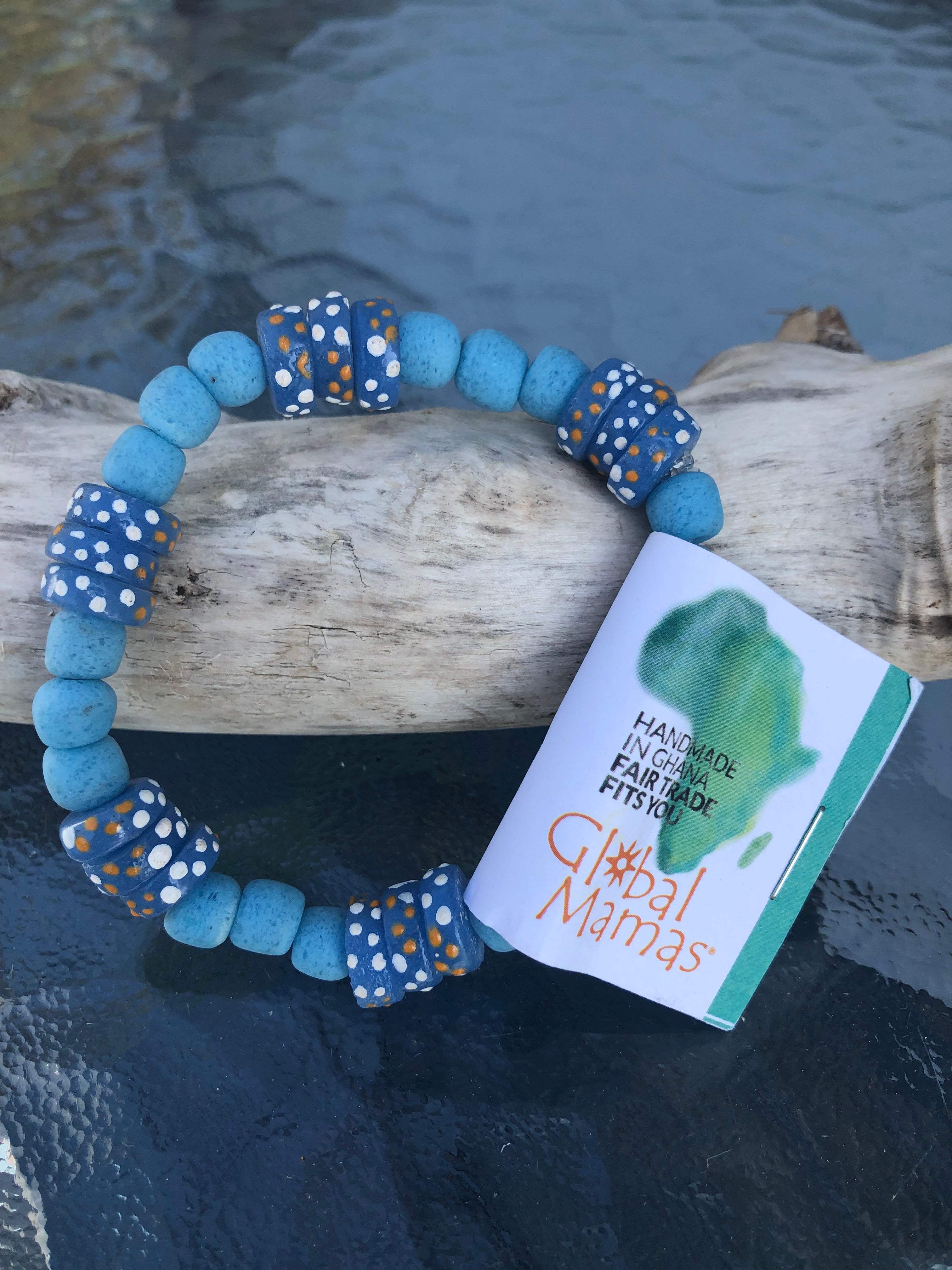 This spunky accessory is full of personality and has an eye-catching mix of baby blue large glass beads and uniquely hand-painted sky blue disc-shaped beads. The playful colour palette brings a breezy, uplifting vibe that is perfect for brightening any outfit.