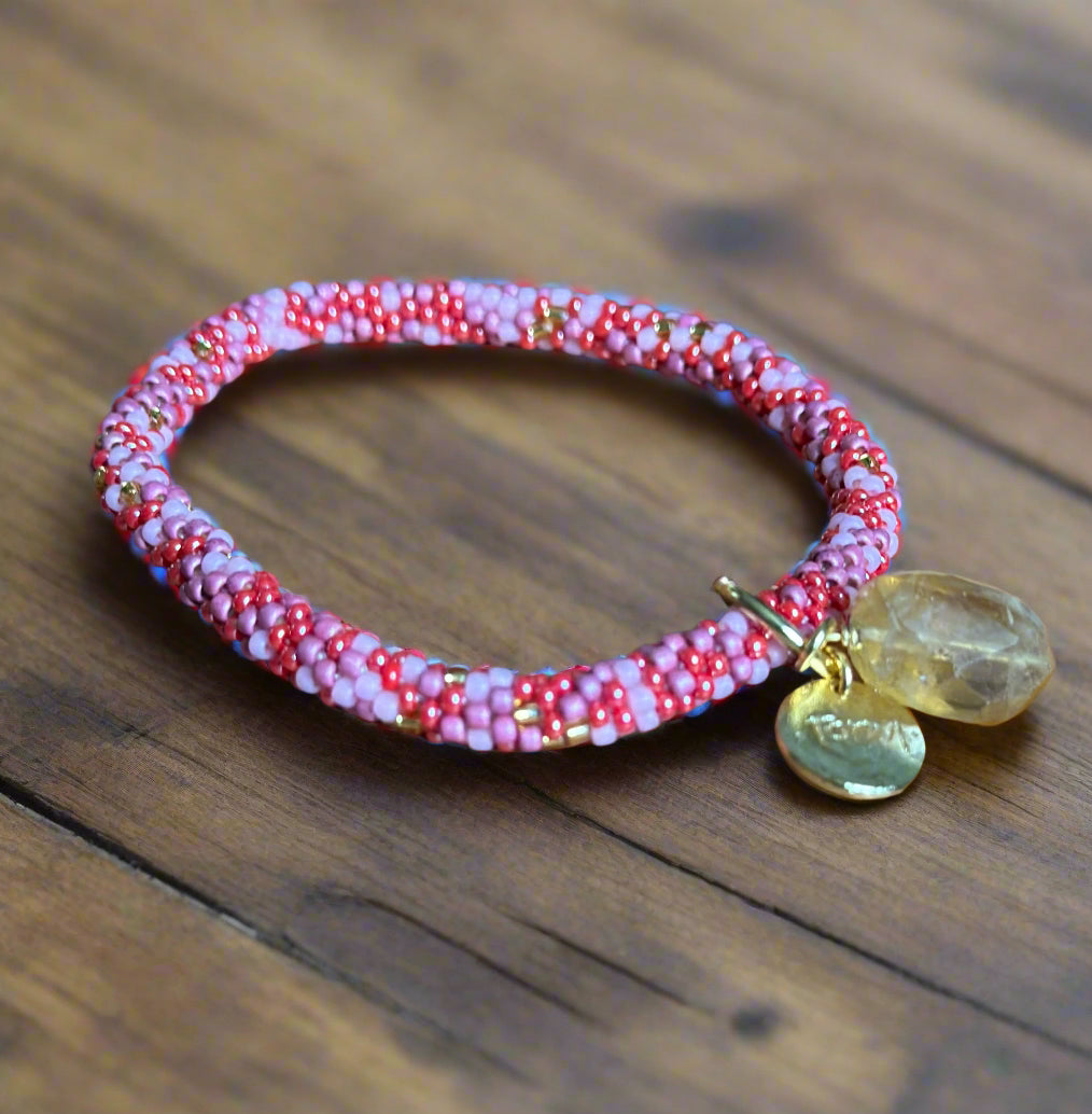Pink Patterned Roll-on Bracelet with Gold Charm & Gemstone (2 options)