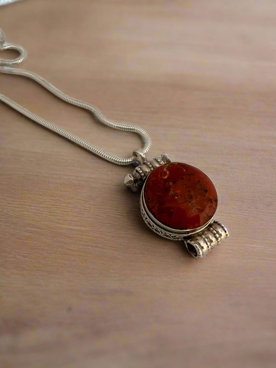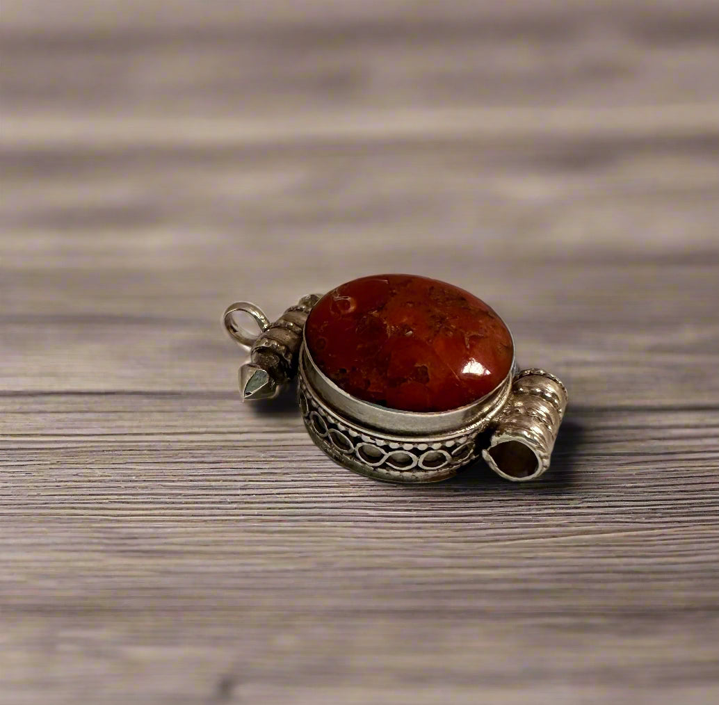 Handcrafted in sterling silver, this 1” diameter locket features intricate metalwork. It is available in turquoise, known for its calming, balancing energy, or coral, a vibrant symbol of strength, passion, and protection. The silver clasp adds a unique, artisanal touch and measures ½", making it easy to wear with your favourite chain.