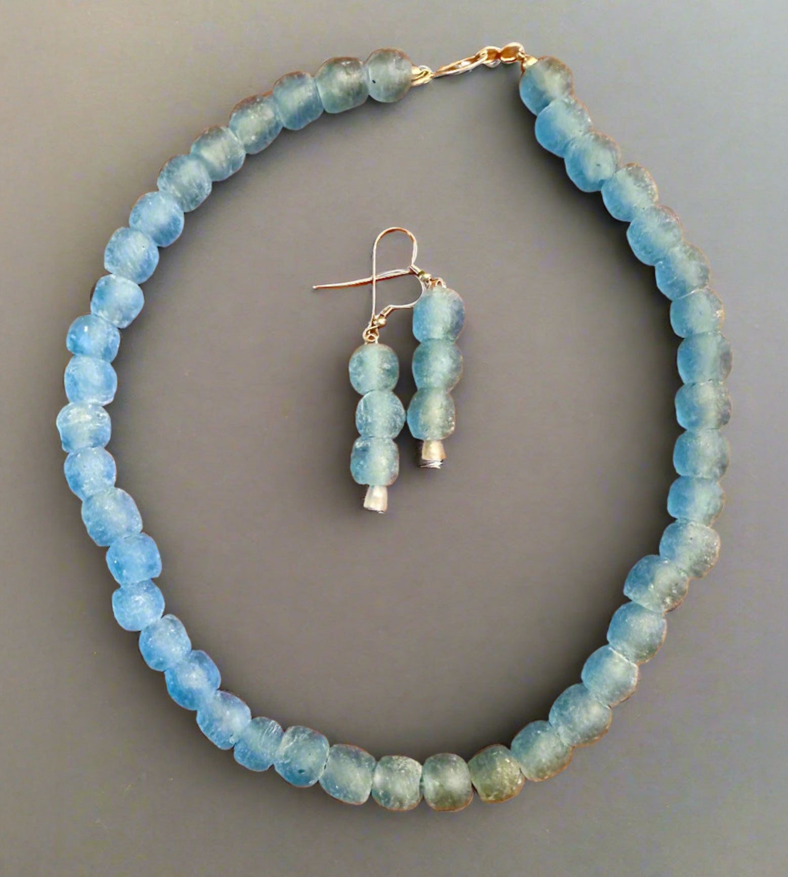 Glass beaded necklace and earrings are set in sunlit blue hues.